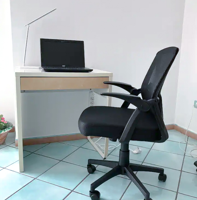 Il soggiorno è un ampio open space che forma unico ambiente con l'ingresso dell'appartamento, con due divani da seduta ed un divano letto convertibile in letto matrimoniale. Completano l'arredamento della stanza, un ampio tavolo da pranzo, una comoda e pratica postazione per lavoro da remoto con lampada caricabatterie ed una presa multipla, un televisore con schermo da 43" con ricezione di canali del digitale terrestre ed una confortevole sedia a dondolo.