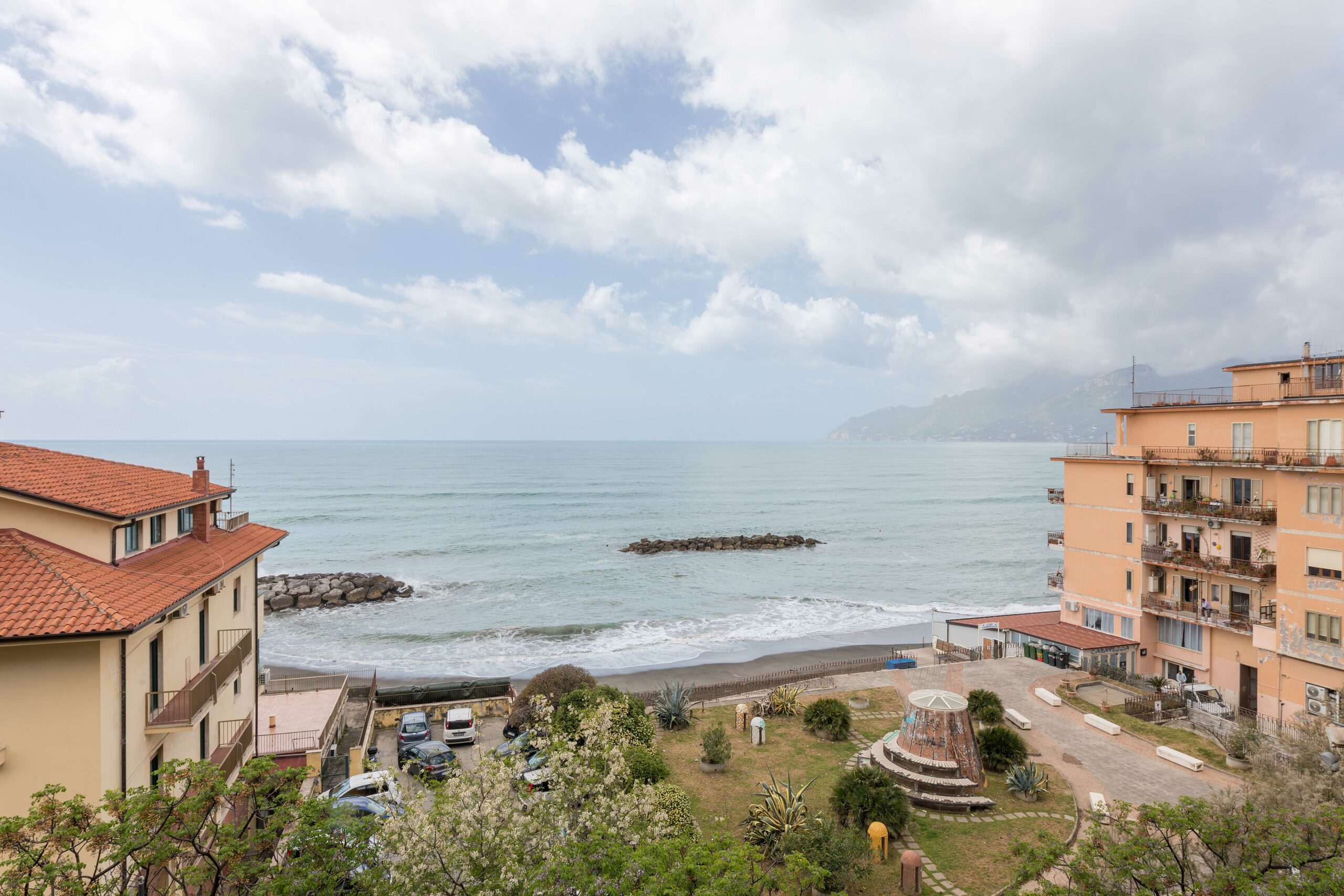 In questa stanza troverete un letto matrimoniale con biancheria da letto in cotone di alta qualità, eleganti copriletti per il massimo livello di igiene ed un capiente armadio dotato di specchio incorporato. La camera da letto matrimoniale è dotata di accesso al terrazzo di casa, che vi permetterà di godere di un notevole punto panoramico, per ammirare il golfo di Salerno e la Costiera Amalfitana, le montagne che sovrastano la costa ed il Castello di Arechi. Completano le forniture della stanza, una tv dotata di dispositivo smart tv, per godere delle proprie app di streaming preferite, l'aria condizionata con split.